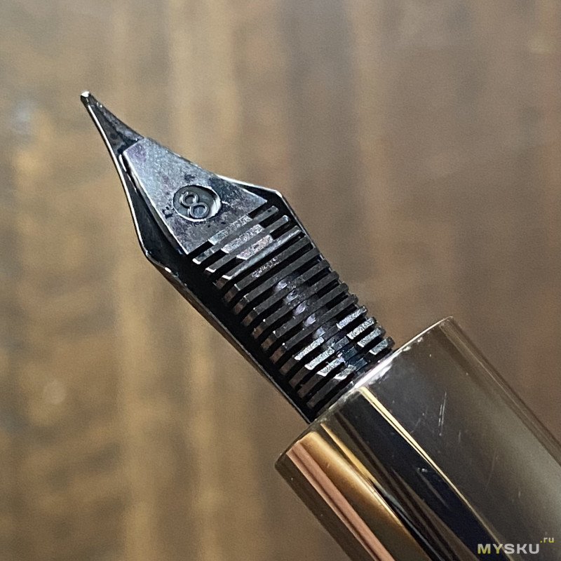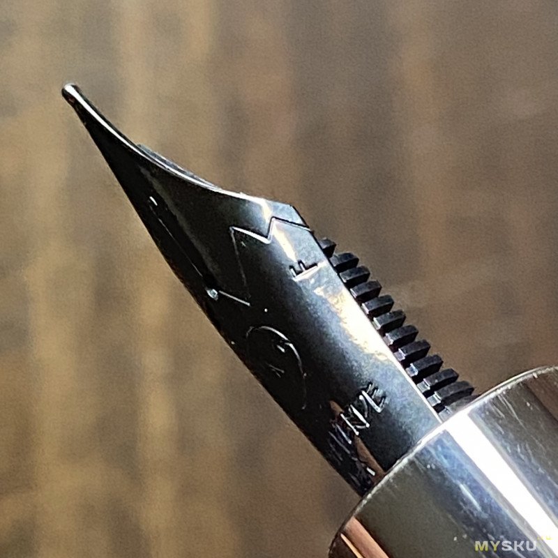 Перо — стальное, воронённое, шестого размера, от JoWo, слегка перегруженное надписями и логотипами, размерность (F) указана на правой половинке сбоку. Фидер обыкновенный, пластиковый.