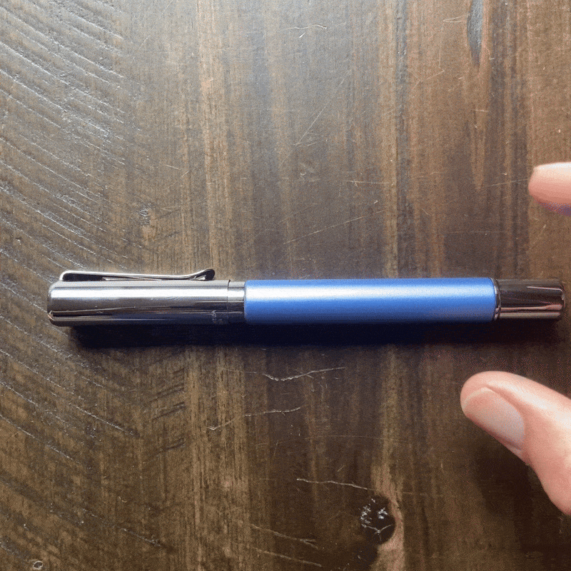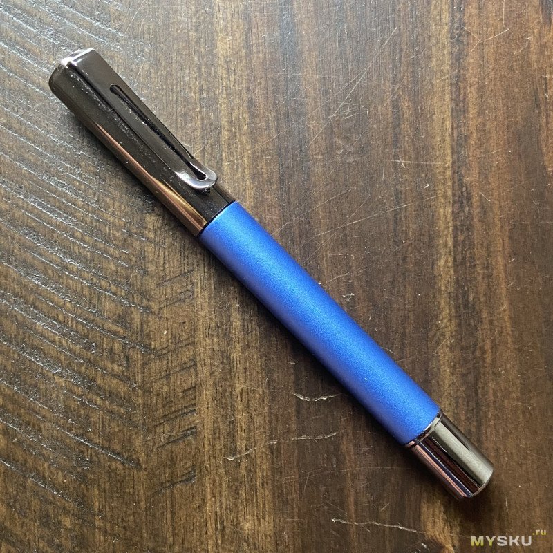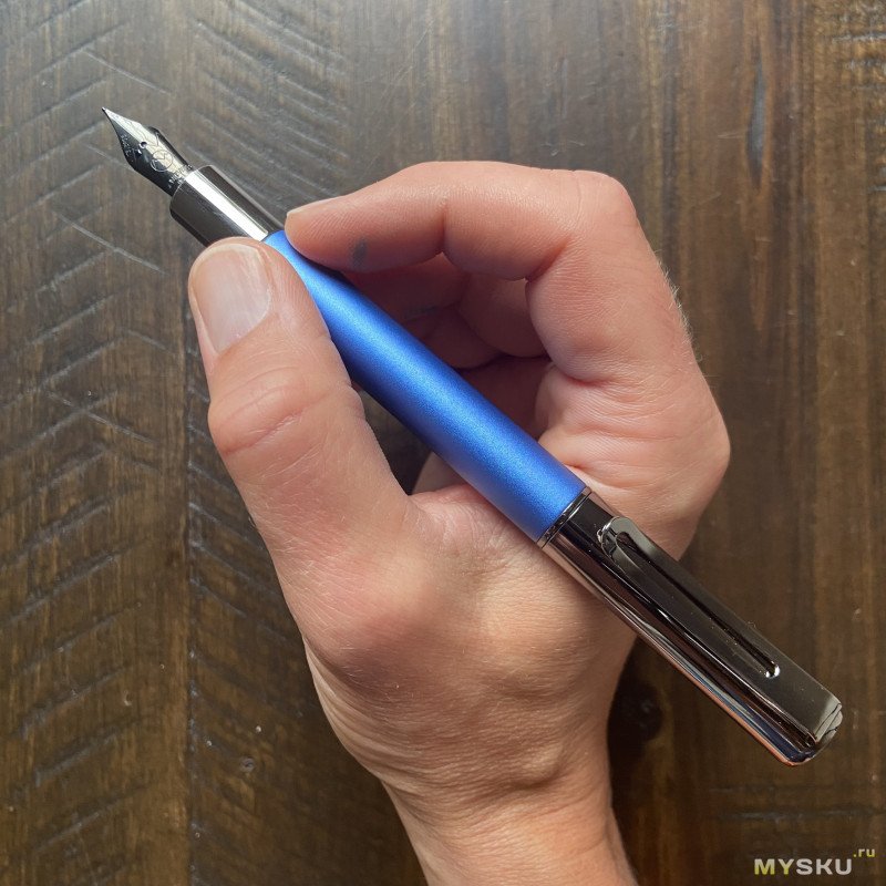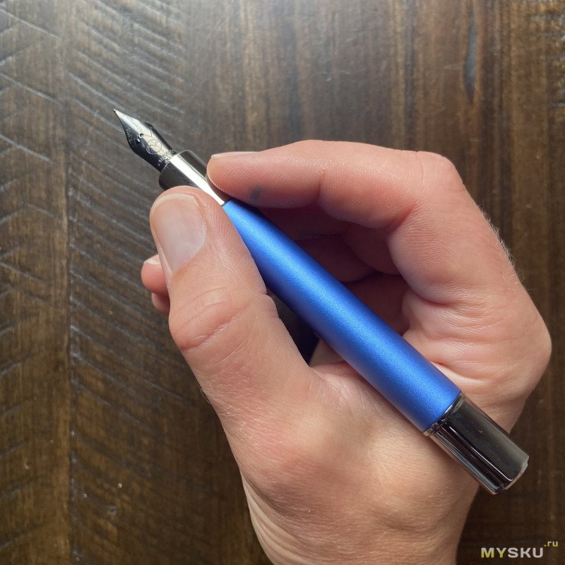 Ручка хорошо и надёжно лежит в руке, увесисто и ёмко — я такое люблю. Секция, при всей моей нелюбви к гладкому металлу, достаточно ухватиста и не норовит выскочить из пальцев. С надетым на ручку колпачком баланс сильно смещается в верхнюю часть, писать так не очень удобно.