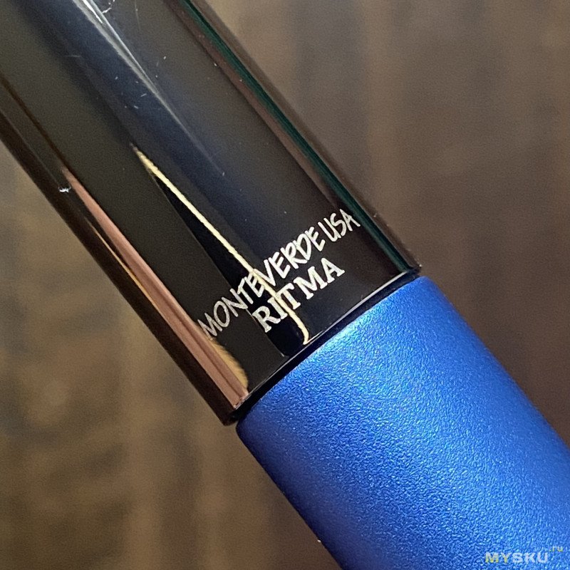 Части ручки по отдельности тоже изящны — только взгляните на этот разрез на клипе и приятную впадинку на вершине колпачка. Клип довольно тугой, но при этом функциональный — спасибо приподнятому вверх кончику. Внизу колпачка написано (лазерной гравировкой) «Monteverde USA RITMA». Торец ручки — прямой (т.н. флэттоп — flat top — плоское навершие). Между корпусом ручки и торцом есть небольшая ступенька (предназначена для удержания колпачка плюс симметрия с внешним видом секции). Сам по себе корпус ручки — приятно-шершавый на ощупь.