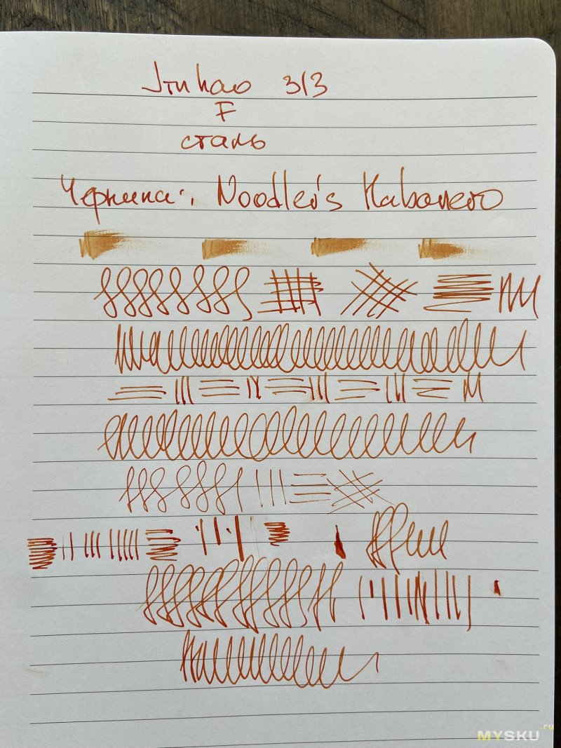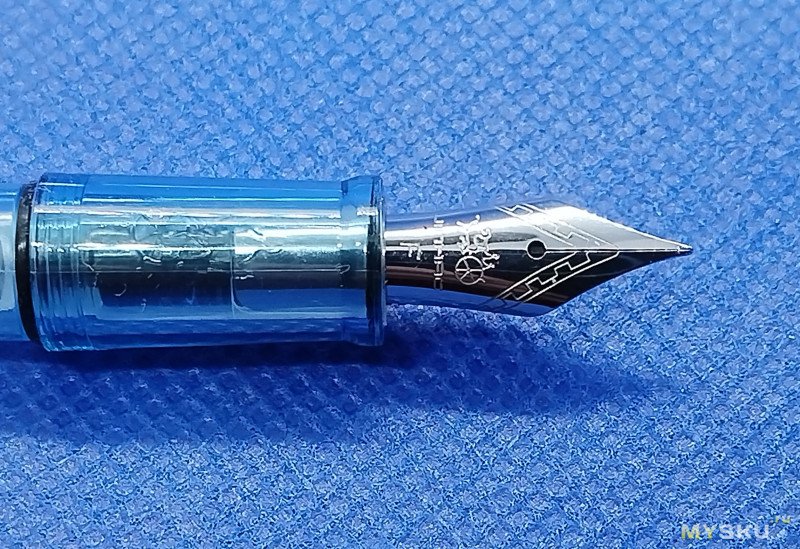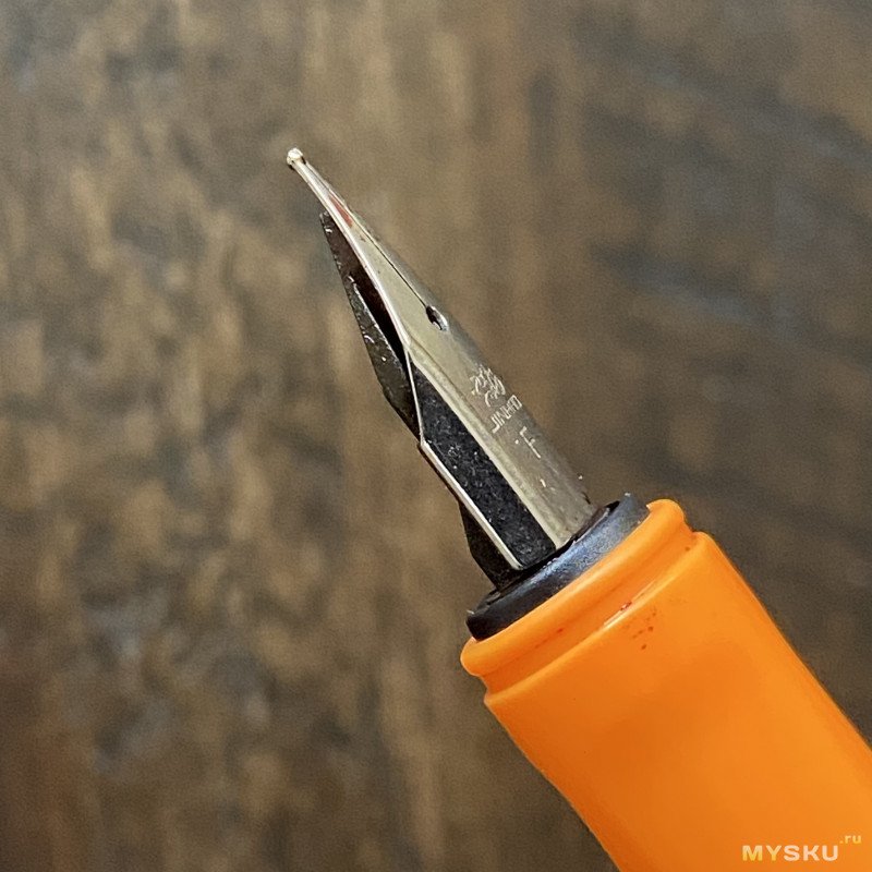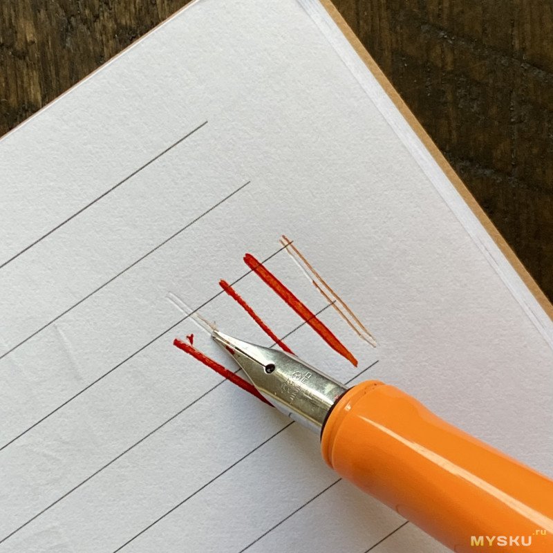 Что же касается того, как пишет перо — то тут без особых сюрпризов (условную пластилиновую мягкость оставим в стороне): вполне себе внятная F линия, обильная подача (но тут ещё и чернилам спасибо), отсутствие хардстартов, пропусков и всяких там фидбэков (звуковой чуть-чуть присутствует). Обратной стороной писать можно, сухо, чуть подцарапывает.