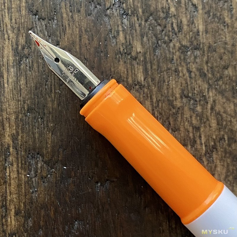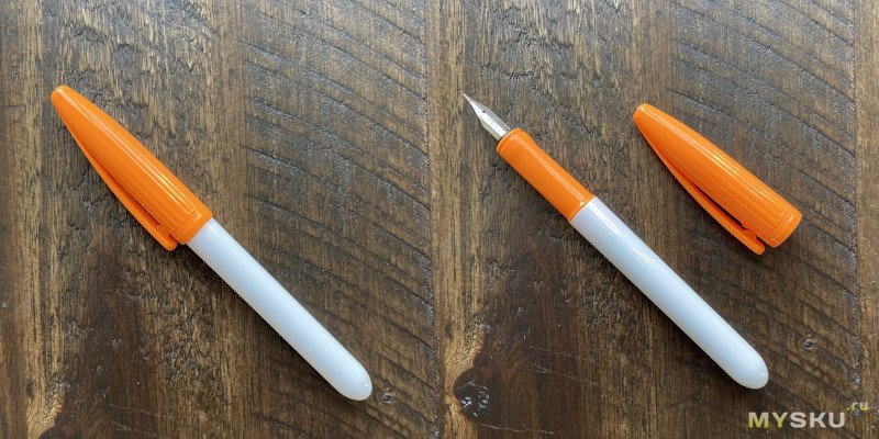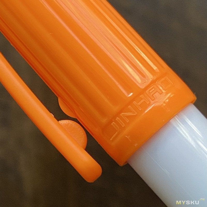 Ручка умеренно тонкая и короткая, корпус сделан из белого пластика, на торце — технологическая выемка, ребристый пластиковый же колпачок контрастного оранжевого цвета с не самым обычным дизайном клипа, к которому, к слову, довольно быстро привыкаешь. Сильно отгибать клип я бы не рекомендовал, думаю, что запросто может «оторваться». На торце колпачка чёрного цвета пластиковая заглушка. Единственная отсылка к бренду — надпись Jinhao с правой стороны от клипа, модель же нигде не написана.