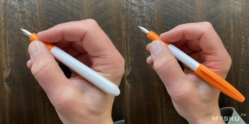 В руках пишущее изделие лежит довольно удобно, веса совершенно не замечаешь. Тонкость тоже не особо бросается в глаза, спасибо хорошим пропорциям. Колпачок на ручку