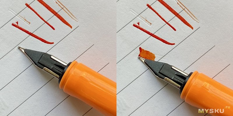 К счастью, лечится такое очень просто методом от обратного — поворачиваю перо, и давлю, чуть покачивая его из стороны в сторону, на бумагу обратной стороной (только давление не на кончик, а на всю плоскость пера — чтоб она максимально касалась фидера).