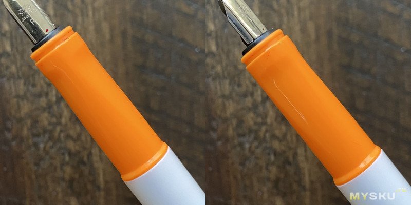 Колпачок снимается без проблем, обратно защёлкивается умеренно громко и приятно.