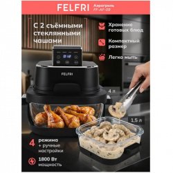 Многие помнят, с чего начинались аэрогрили: это были большие и тяжелые стеклянные кастрюли с нагревательным элементом сверху. Фелфри решили вспомнить классику, но только в виде аэрогриля-трансформера. Одна нагревающая головка и две чаши- средняя и малая. Есть возможность использовать чаши в виде контейнера для готовых блюд.